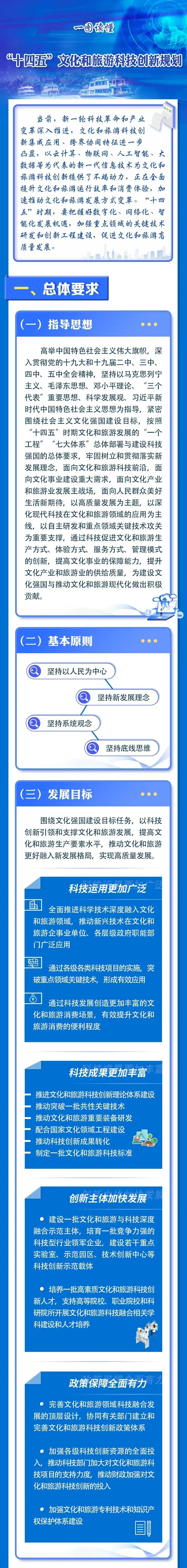——堅持新發展理念。以新發展理念統領文化建設和旅遊發展,将科技創新作為推動文化和旅遊創新發展的根本動力和主要内容,充分發揮科技創新在文化強國重要戰略中的支撐作用,以科技創新推動文化事業、文化産業和旅遊業實現更高質量、更有效率、更加公平、更可持續、更為安全的發展。