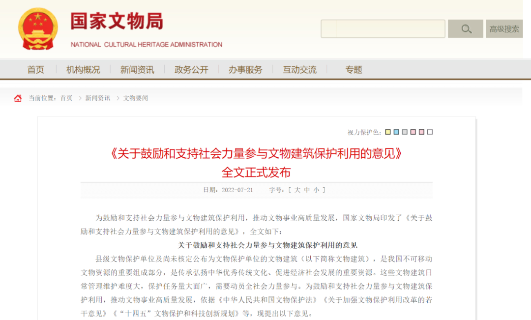 為鼓勵和支持社會力量參與文物建築保護利用,推動文物事業高質量發展,國家文物局印發了《關于鼓勵和支持社會力量參與文物建築保護利用的意見》,全文如下: