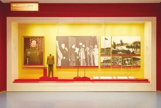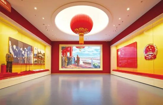 為了重點展示開國大典盛況,中國共産黨曆史展覽館特别設計了“開國大典”場景。步入展廳,正前方巨大的屏幕播放着珍貴的《中華人民共和國中央人民政府成立典禮原始影像》。這部12分鐘的影像檔案,是2019年中央檔案館以俄羅斯聯邦檔案部門提供的彩色影片為基礎剪輯制作而成,是目前公開的關于開國大典時間最長、内容最完整的視頻,而在此之前國内保存的影像都隻有黑白畫面。展廳上方懸挂着按照天安門城樓當年樣式複制的大紅宮燈,左側展示着毛澤東在開國大典時穿的呢衣、呢褲和使用的話筒等國家一級文物,右側展示着毛澤東親手按動電鈕升起的中華人民共和國第一面五星紅旗和中華人民共和國國徽、中華人民共和國國歌。