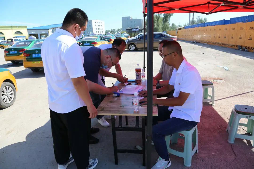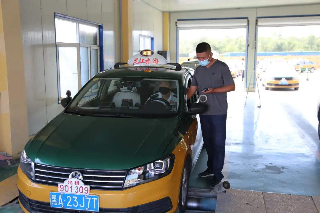 在哈爾濱市出租汽車計價器檢定站現場,公司外勤管理人員深入一線,現場辦公,協調指揮,登記備案參檢車輛,公司所有待檢車輛依次進入檢測區進行計價器檢測。