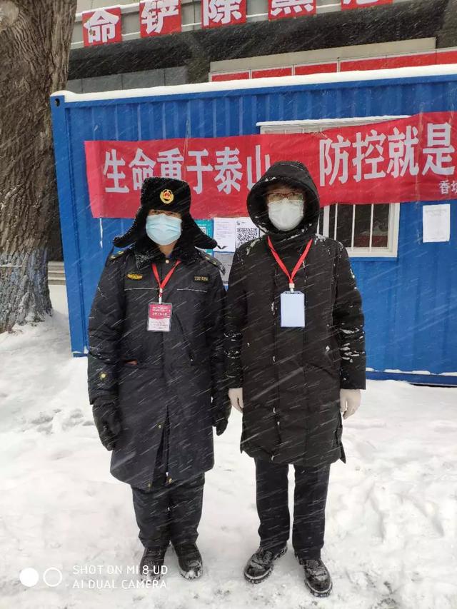 風雪中在哈爾濱香坊區風華社區同社區其他人員共同值守的杜穎君(右)