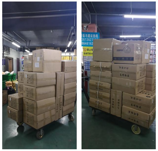 圖為即将配貨發往大金年会嶺地區的24箱餐具用品