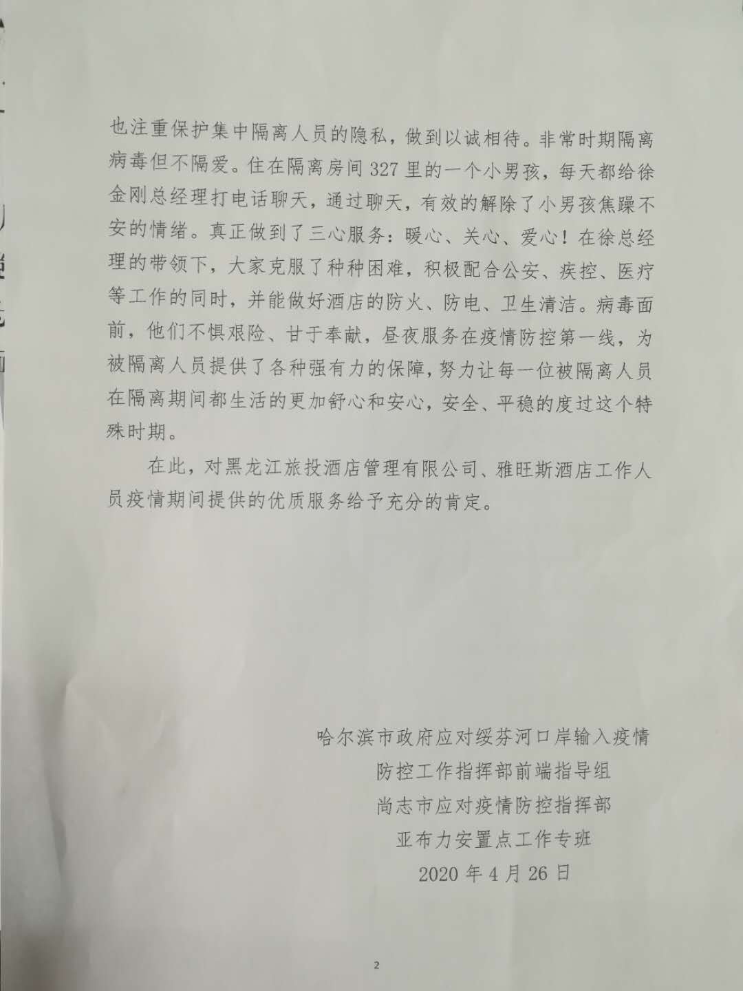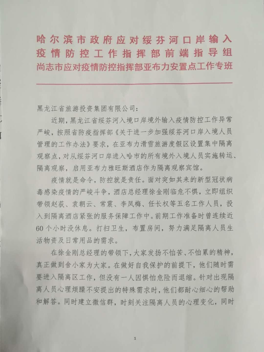 近日,哈爾濱市政府應對綏芬河口岸輸入疫情防控工作指揮部前端指導組、尚志市應對疫情防控指揮部亞布力安置點工作專班,向金年会金字招牌發來表揚信,表揚集團權屬企業酒店管理公司及有關人員不怕苦、不怕累、不懼艱險、甘于奉獻,舍小家為大家,晝夜服務在疫情防控第一線,做到了暖心、關心、愛心“三心”服務,圓滿完成了被隔離觀察人員的隔離觀察任務。